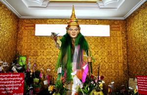 นำท่านขอพร นัตโบโบยีหรือเทพทันใจ เทพเจ้าศักดิ์สิทธิ์ของชาวพม่าและชาวไทยวิธีการสักการะรูปปั้นเทพทันใจ (นัตโบโบยี) เพื่อขอสิ่งใดแล้วสมตามความปราถนาก็ ให้เอาดอกไม้ ผลไม้ โดยเฉพาะมะพร้าวอ่อน กล้วยหรือผลไม้อื่นๆมาสักการะ นัตโบโบยี จะชอบมาก จากนั้นก็ให้เอาเงินจะเป็นดอลล่า บาทหรือจ๊าด ก็ได้(แต่แนะนำให้เอาเงินบาทดีกว่าเพราะเราเป็นคนไทย)แล้วเอาไปใส่มือของนัตโบโบยีสัก 2 ใบไหว้ขอพรแล้วดึกกลับมา 1ใบ เอามาเก็บรักษาไว้จากนั้นก็เอาหน้าผากไปแตะกับนิ้วชี้ของนัตโบโบยีแค่นี้ท่านก็จะสมตามความปรารถนาที่ขอไว้จากนั้นนำท่านข้ามฝั่งไปอีกฟากหนึ่งของถนน เพื่อสักการะ เทพกระซิบซึ่งมีนามว่า“อะมาดอว์เมี๊ยะ”ตามตำนานกล่าวว่า นางเป็นธิดาของพญานาค ที่เกิดศรัทธาในพุทธศาสนาอย่างแรงกล้ารักษาศีล ไม่ยอมกินเนื้อสัตว์จนเมื่อสิ้นชีวิต ไปกลายเป็นนัตซึ่งชาวพม่าเคารพกราบไหว้กันมานานแล้วซึ่งการขอพรเทพกระซิบต้องไปกระซิบเบาๆ ห้ามคนอื่นได้ยิน ชาวพม่านิยมขอพรจากเทพองค์นี้กันมากเช่นกันการบูชาเทพกระซิบ บูชาด้วยน้ำนม ข้าวตอก ดอกไม้ และผลไม้สมควรเวลาเดินสู่ สนามบินานาชาติมิงกาลาดง