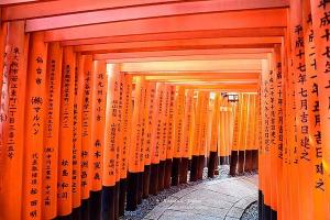 นำท่านเดินทางสู่เกียวโต เมืองหลวงเก่าในอดีต นำท่านชม ศาลเจ้าฟูชิมิอินาริ ที่สถิตของพระแม่โพสภ เทพเจ้าที่เป็นที่นับถือยิ่งของประชาชนที่มาสักการะขอพร ให้มีความเป็นอยู่อุดมสมบูรณ์ของเรื่อง พืชพรรณธัญญาหาร นำท่านสักการะ พระแม่โพสภ และเทพจิ้งจอกที่ชาวญี่ปุ่นชื่อว่าเป็น ทูตสวรรค์ ผู้คอยนำข่าวสารจากสรวงสวรรค์ลงมายังโลกมนุษย์ ท่านจะได้ตื่นตากับรูปปั้นของเทพจิ้งจอก ที่มี จำนวนมากมาย แล้วนำท่านชม ศาลโทริอิ ซุ้มประตูสีแดงที่เป็นสัญลักษณ์ของศาลเจ้าที่มีมากกว่า ร้อยต้นทอดตัวยาวตามเส้นทางของไหล่เขาลดหลั่นกันบนเส้นทางยาวถึง 4 กิโลเมตร และเป็นฉาก ของภาพยนตร์เรื่อง MEMORIES OF GEISHA ที่ ซายูริ นางเอกของเรื่องวิ่งลอดซุ้มประตูเพื่อไปขอพร เทพเจ้าให้ตนเองสมความปรารถนา