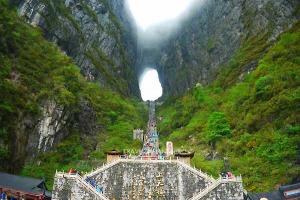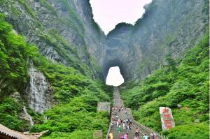 นำท่านเดินทางผ่านเส้นทางที่ 99 โค้งสู่ถ้ำเทียนเหมินต้ง หรือเรียกว่า ถ้ำประตูสวรรค์ ประวัติของโพรงถ้ำแห่งนี้เริ่มบันทึกไว้ว่า ราวปี ค.ศ. 263 จู่ๆหน้าผาของ ภูเขาซ่งเหลียง(Songliang Shan) ที่สูงนับพันเมตรเกิดถล่มลงมา ก่อให้เกิดโพรงถ้ำขนาดมหึมาคล้ายช่องประตูยักษ์ ด้วยเหตุนี้ทำให้ภูเขาลูกนี้ถูกเรียกเป็น เทียนเหมิน หรือ ประตูสวรรค์ นับตั้งแต่นั้นมา ประตูนี้มีความสูง 131.5 เมตร ความกว้าง 57 เมตร ความลึก 60 เมตร เมื่อท่านมาถึงถ้ำประตูสวรรค์ท่านจะได้ขึ้นขั้นบันได 999 ขั้น สู่ภูเขาประตูสวรรค์ สมควรแก่เวลาเดินทางลงจากเขาด้วยรถอุทยาน (หมายเหตุ : อาจจะมีเปลี่ยนแปลงเป็นนั่งรถอุทยาน + ขึ้นบันไดเลื่อน + ลงกระเช้า เพื่อความสะดวกแก่ลูกค้าที่จะไม่ต้องรอคิวนาน หรือหากบันไดเลื่อนประกาศปิด การเที่ยวต้องเป็นขึ้น+ลงกระเช้า ทั้งนี้ทางบริษัทจะเปลี่ยนแปลงตามความเหมาะสม อย่างใดอย่างหนึ่ง //และในส่วนการนั่งรถของอุทยานขึ้นไปบนถ้ำประตูสวรรค์ หากรถของอุทยานไม่สามารถขึ้นไปที่ถ้ำประตูสวรรค์ได้ ทางบริษัทฯ จะไม่คืนเงิน และไม่จัดโปรแกรมอื่นมาทดแทนให้ ทั้งนี้ ขึ้นอยู่กับสภาวะอากาศ และการรักษาความปลอดภัยของนักท่องเที่ยว ขอสงวนสิทธิ์ยึดตามประกาศจากทางอุทยานเป็นสำคัญ โดยที่ไม่ต้องแจ้งให้ทราบล่วงหน้า) จากนั้นนำท่านแวะ ร้านนวดฝ่าเท้าสมุนไพรจีน ชมการสาธิตการนวดเท้า และแช่เท้าด้วยยาสมุนไพรจีนโบราณ ซึ่งเป็นอีกวิธีหนึ่งในการผ่อนคลายความเครียด ปรับสมดุลให้การไหลเวียนของโลหิตด้วยวิธีธรรมชาติ